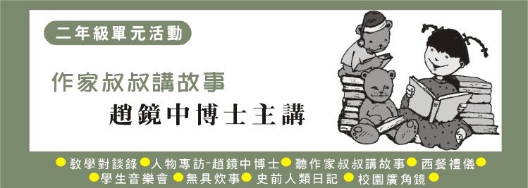 今天學校來了一位作家,我好興奮。我們來到一個放滿椅子的教室,我找了一個空位坐下來,趙博士來了,我興奮極了。趙博士一來就說:「我叫趙鏡中,你們可以叫我趙博士。」一開始,我們還是靜靜的坐著聽,但是一下子變得好熱鬧,我們專心的聽。第一:他拿了自己做的書給我們看,真的好棒喔!第二:我們看了畫家畫的圖,我一本接一本的看,雖然看的時間不多,可是真的很美麗。第三:趙博士用形狀模型來說故事,雖然有點奇怪又有點好笑,但是很好聽。將來我也想當作家,跟趙博士一樣。