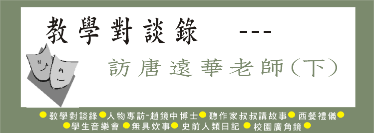 Q15:身處現代這個亂世中,您認為諸子百家中的那一套思想可適用於現代? A15:儒家。因為它合於中道,最能展現時代性,能適用於任何時代,也可作為自己心靈的一個教育指標。它講求“禮”來治世,事實上是沒錯的,因為除了法律之外仍要建立倫理觀念,才能穩定社會的秩序。而為了因應時代之需要,在君臣、父子、夫婦、長幼、朋友五倫外,可另建以“群體”為中心的“第六倫”,因為現今社會,人們雖然愈住愈近,但人心卻愈隔愈遠,所以“第六倫”的建立是必要的。 Q16:請問您如何管教自己的小孩? A16:我認同儒家思想,但我卻用放任的方法來管教自己的小孩,然而儘管如此,我仍會有一個道德的大綱,該做的事還是要做。 訪問心得 溫中承 歷史老師的確很特別,唐老師是實中的名師,無庸置疑。她的教學內容及其方式,即便是「挑剔的實中生」也多所肯定,但她若因此而稱為特別,是叫人難以信服的,補習界不也有所謂的名師嗎?唐老師的特殊,在於她的教育態度及對自我的要求。就像在訪問中所提到,她之所以教書時間沒有那麼長,乃是因為每當她覺得有需要,就隨時去充實自己,不管她的頭頂已被套了多少的光環。「學生就是學生,有叛逆的心,不成熟的思想,不能用成人的標準看待,多一點關心,多一點愛」唐老師這句話不是用嘴巴說的,是生命行過所留下的足跡。 林雅婷 上唐老師的課很有意思,她讓我真的感覺到,所謂的「歷史」,的確是由許多大大小小的事件、人的活動,錯綜複雜的進行著----而不是一堆惱人的人名、年代、地名和考驗背誦功力的文字。她上課的態度是很嚴謹投入的,這些都可以從她的上課方式裡看出來,我相信她當初一定真的對「歷史」這門學科有相當高度的興趣與熱情,並且對各個歷史人物,相關事件都有透徹深入的了解,這讓她上課中舉手投足間流露出自信,也因為她了解歷史人物的獨特個性,更能以其角度去詮釋整個歷史事件,讓我們有身歷其境的感受。如在鴻門宴中,我們看到了項羽的單純,張良的機智,亞父的煩惱;秦始皇統一天下,我們看到他的獨斷面和雄心壯志….如果要我說,現在高一上甚麼課最有意思,我想我會說:「莫過於歷史吧」 楊之穎 從第一堂歷史課開始,我就感覺到唐老師是一位與眾不同的老師,而經過這一次的訪問,我更如此覺得。唐老師在言談之中和上課時都流露出她獨到的歷史見解以及人生觀,也顯現出她的幽默感。我在這次訪問之中,對許多話都印象深刻,如老師說她佩服孔明時,她說「不一定要活得長,但要活得有意義」。我很敬仰老師那永遠求進步的精神,老師雖說她對自己的教學尚不完全滿意,但在學生的眼裡,這樣的老師,這樣的課,已經是可遇不可求了!